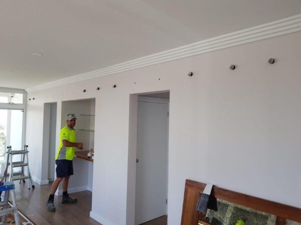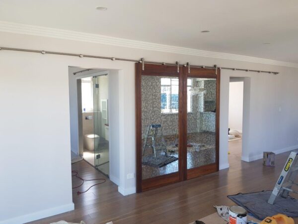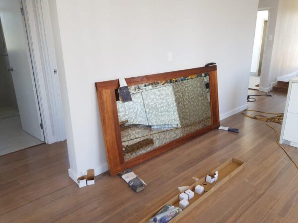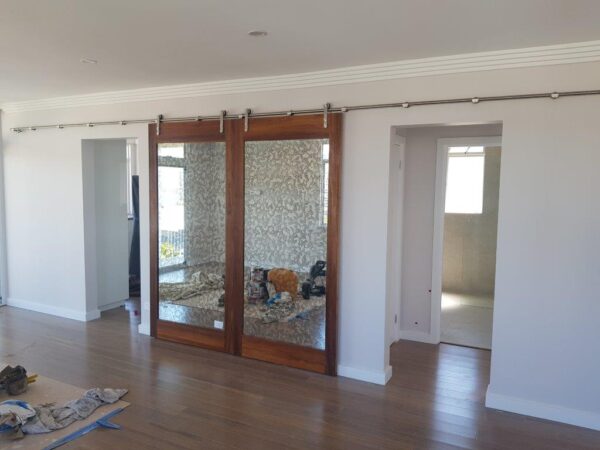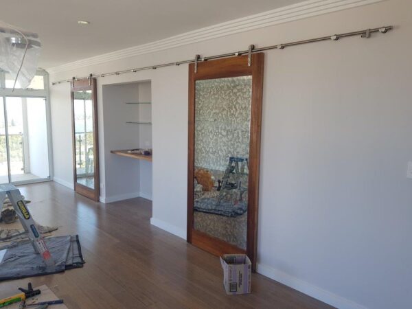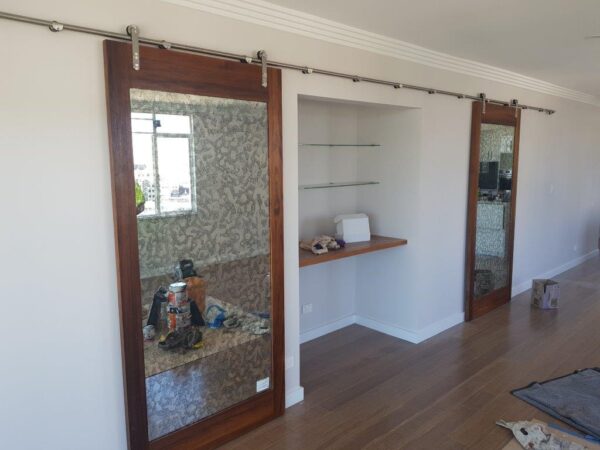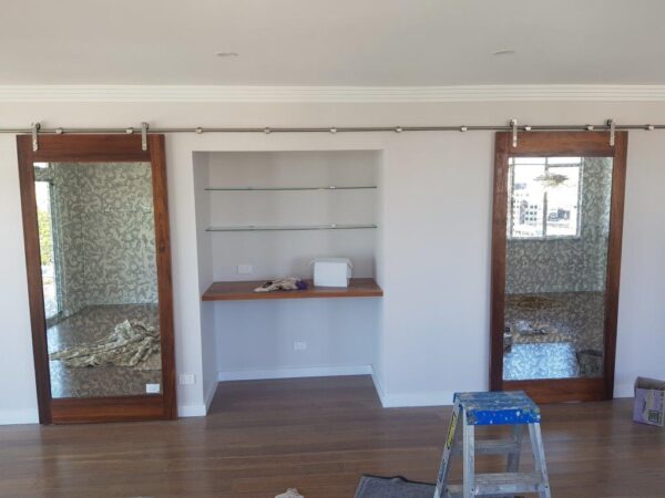 Next we installed the sliding doors. The doors were custom-made with timber frames, designed to complement the apartment’s modern aesthetic. The doors served a dual-purpose, functioning both as entryways and as decorative features that enhanced the apartment’s interior. One of the standout features of the doors was their textured mirror design. The mirrors added depth and light to the apartment while offering a stylish, reflective surface that served as both a practical and decorative element.