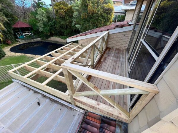 The scope of the project involved removing the damaged decking and balustrading, preparing the area for new installations, replacing the decking and balustrading with new pine wood components and installing a timber pergola frame, which the homeowner opted to finish independently.