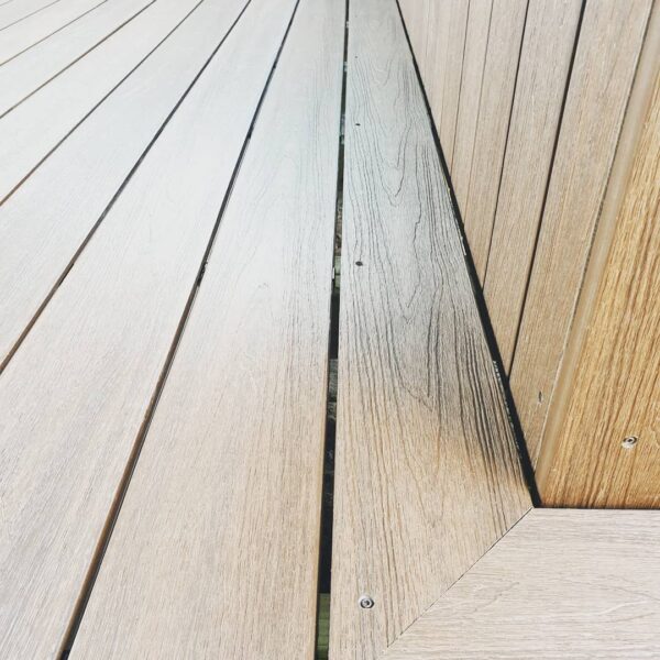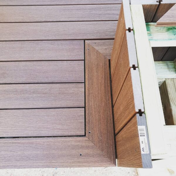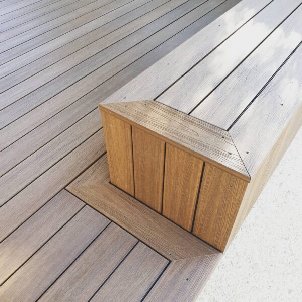 Once we had constructed the subframe, the team began installing composite decking boards to finish the deck and bench seating. Composite decking was selected for its durability and ease of maintenance. Unlike traditional wood decking, composite boards require minimal upkeep and maintain their appearance for many years.